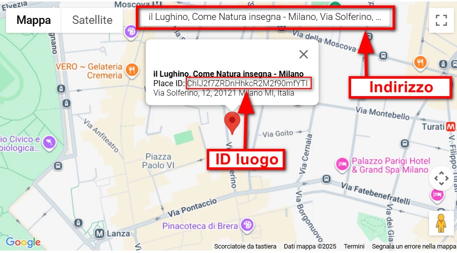 L’ID è la stringa di caratteri accanto a Place ID. L’abbiamo colorata di rosso in modo che tu possa vedere qual è. È questa che dovrai copiare: selezionala e salvala negli appunti.