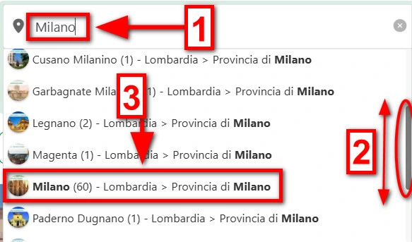 2. Nel primo campo di ricerca, contrassegnato con il segnaposto (Pin posizione), inserisci una città, una provincia, una regione o uno stato. Scrivi ad esempio “Milano” (come mostrato nell’immagine), mentre digiti, vedrai apparire diversi risultati. Scorri l’elenco con la piccola barra di scorrimento e seleziona:Milano – Lombardia > Provincia di Milano