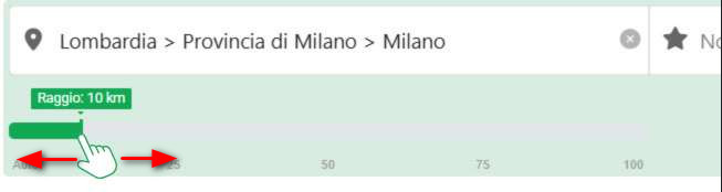 1. Dopo aver selezionato la località, comparirà una barra verde con un cursore che ti permette di impostare il raggio di ricerca, da 5 km a 100 km. Il raggio viene calcolato in linea d’aria sulla mappa.