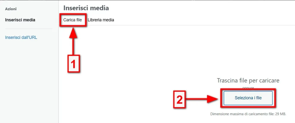- Nella libreria Media, fai clic sul pulsante “Carica file“ in alto e poi su “Seleziona i file“.