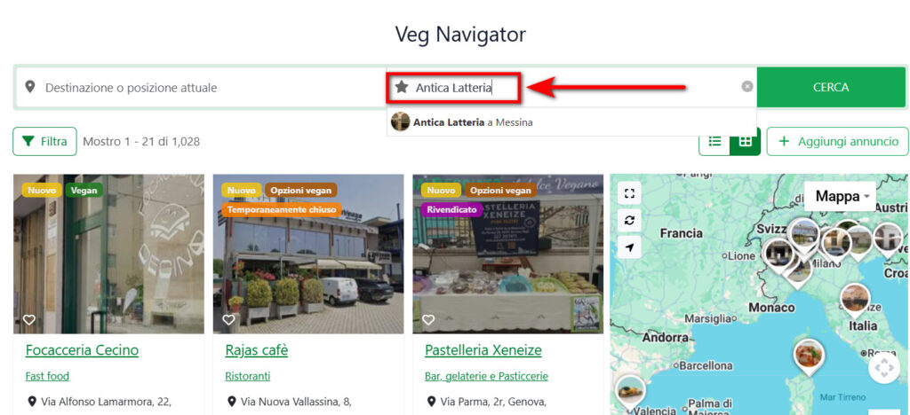 - Vai su Veg Navigator: https://www.esserevegan.it/veg-navigator/ e, se non conosci il link diretto dell’annuncio, cercalo utilizzando il secondo campo (quello con la stella ⋆).